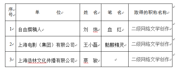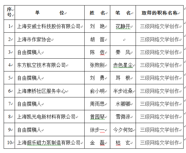 2020年度上海市文學(xué)創(chuàng)作系列網(wǎng)絡(luò)文學(xué)專業(yè)中級技術(shù)職稱評審?fù)ㄟ^人員名單公示 2020-12-24