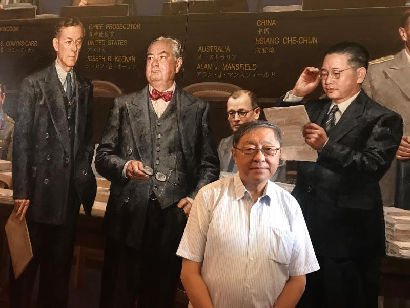 76歲的上海交通大學數(shù)學系退休教授向隆萬在《東京審判》大型油畫前駐足,畫面上有他的父親、東京審判中國檢察官向哲濬。今年書展現(xiàn)場設立的“東京審判巨幅油畫·出版工程”展示專區(qū),集結了多種200余卷東京審判相關文獻與研究著譯。為了讓讀者感受東京審判的莊嚴氛圍,畫家李斌直到書展開幕前一天,還在修改油畫上的細節(jié)?!俺霭媸抢硇缘氖崂?,繪畫是感性的呈現(xiàn)?!毕蚵∪f站在油畫長卷前很感慨,“這幾年的上海書展,幾乎都有東京審判方面的專著與讀者見面,這段過去不為人知的歷史通過上海出版人的努力,被越來越多讀者知道、了解?!?/p>